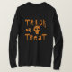 Suéter de Halloween con slogan naranja y negro "Trick or Treat" con temblor de color naranja chillón y motivos de cráneo. Varios tamaños y estilos para hombres, mujeres y niños.