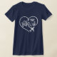 Las palabras blancas del guión "Una Esposa Piloto" dentro de un corazón blanco, inclinado, con la silueta de un avión siguiendo el flujo del corazón en una camiseta de la marina.