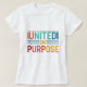 Este diseño de camisetas muestra el mensaje de unidad y objetivos compartidos con el texto "Unidos en propósito" mostrado en un dinámico esquema multicolor. Cada palabra utiliza un color de negrita diferente, creando un diseño dinámico y llamativo que celebra la colaboración y una causa común.