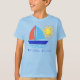 Una divertida velera colorida navega por las olas del océano y brilla por los rayos del sol. El bonito barco es rojo naranja, azul marino y azul acuático. El sol es rojo naranja y amarillo limón. La isla de Sanibel, con letras lúdicas, se encuentra debajo de las extravagantes obras de arte náutico. Esta camisa es perfecta para sus vacaciones familiares.