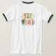 El texto "See the World" se extiende a lo largo de la camisa como un impresionante amanecer. Las letras podrían ser un gradiente vibrante, comenzando con naranjas cálidos y rosados para "Ver" y pasando a blues y morado fresco para "Mundo". Este diseño evoca la promesa de nuevos comienzos y aventuras en diferentes horizontes.