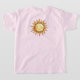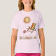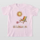 Camisetas de verano para niños. Sol luminoso, silla de playa de rayas amarillas, azules rojas y blancas, conchas marinas y lindos chanclas rojas y blancas.