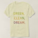 El diseño de la camiseta muestra la frase "Verde, limpio, sueño" escrita en letras negrita y multicolor con una sombra de gota. El texto se centra en un fondo azul claro sólido, creando una composición vibrante y visualmente llamativa. El diseño transmite un mensaje de conciencia ambiental y una perspectiva esperanzadora para un futuro sostenible.