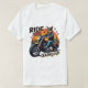 El diseño de Ride Hard Bark Loud" incluye un perro fresco con una chaqueta de cuero y gafas de sol montando una encendida motocicleta naranja contra un horizonte de la ciudad. Ideal para las prendas de vestir con temática de ciclismo, los amantes de los perros y los diseños únicos de trajes de calle.