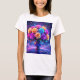 A luminism image of a vibrant bouquet of roses arranged in a stunning, ornate vase, bursting with surreal neon colors and glowing gradients. The petals shimmer in electric oranges, pinks, purples, and blues, with swirling patterns and luminous highlights. The vase reflects a kaleidoscope of colors, surrounded by a soft mist of iridescent light and abstract shapes. AI generated image.
