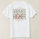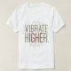 La camiseta muestra el texto "Vibrate Higher" en un vibrante espectro de colores. Cada letra fluye al siguiente como una ola, creando un aspecto dinámico y energético.