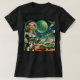 Vintage-futuristic, science fiction illustration of a beautiful female astronaut holding a vintage-style ray gun while shooting out green lasers at the Mother Ship.