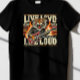 Aquí hay otro diseño de camisetas de estilo vintage inspirado en una banda de rock con un tigre rugiendo con una guitarra eléctrica, rodeado de llamas, y la frase "Live Loud" 🎸 🔥 🐅