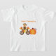Whimsical bicicleta moto calcetín mono con calabaza grande naranja y personalizable texto de Acción de Gracias sobre fondo blanco