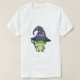 Cast a spell of cuteness with this enchanting digital illustration featuring a little green frog dressed as a sorcerer. The magical amphibian wears a large, crooked dark blue hat decorated with golden stars and a crescent moon. Holding a gnarly wooden staff topped with a glowing blue crystal, the frog stands with a confident, friendly smile and wide yellow eyes. The artwork combines fantasy elements with an adorable cartoon aesthetic.