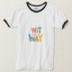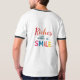 El diseño de la camiseta "Riches with a Smile" incluye la frase en un arcoiris de colores contra un sólido fondo azul claro. Es un diseño profesional de alta calidad con un mensaje positivo y alentador.
