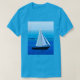 Tee en arte poster semi abstracto y minimalista de un yate en el mar, sobre un fondo marino cobalto y azul ceruleño
