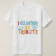 El diseño de la camiseta declara audazmente "I Volunteer as Tribute" en un esquema multicolor. Los colores variados añaden un elemento dinámico al mensaje, mostrando su valentía y voluntad de destacar.