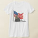 Atracción de un terrier de Yorkshire lindo que se coloca delante de una bandera americana.