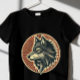 diseño de camisetas geométricas de lobo de estilo vintage, con un efecto angustiado, dibujado a mano con tonos tierra y un sutil fondo de ráfagas de sol. 🐺 🌞