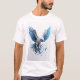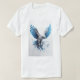 La imagen muestra un majestuoso águila blanca con impactantes acentos azules, que se eleva por el aire con las alas estiradas. El águila parece estar atravesando una barrera de hielo o cristales, añadiendo un sentido de poder y determinación al diseño. La estética general es dinámica y visualmente cautivadora, con una mezcla de detalles realistas y elementos estilizados. La paleta de colores es llamativa, el blanco y el azul contrastan con el fondo gris.