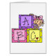 Una niña adorable y tres bloques del alfabeto en las camisetas de ABC del bebé, las tazas, las tarjetas, los pegatinas, las bolsas de asas, los monos, los sellos, y otros artículos.