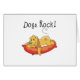Un lindo perro marrón se relaja alegremente en su cama de cachorro y el texto negro dice "¡Roca de perros!" en nuestras camisetas de Roca de Perros, tazas, ratones, botones, tarjetas y más!