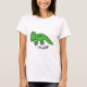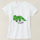 Una figura verde cocodrilo del palillo en las camisetas del cocodrilo, tazas, tarjetas, pegatinas, las bolsas de asas, imanes del cocodrilo, botones, sellos y otra ropa y regalos del cocodrilo.