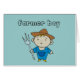 Las tarjetas, las camisetas, las tazas, los pegatinas, y más del muchacho del granjero con un pequeño muchacho rubio del granjero se vistieron en las batas azules que sostenían una bifurcación de la echada.