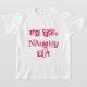 Navidades humorísticos festejan camisetas, sudaderas, tazas, tarjetas, bolsos de té, cadenas de claves, y más con texto rosado caliente que dice "¡Soy el travieso elfo!".