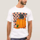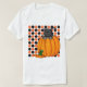 Camisetas de Halloween coloridas, tazas, tarjetas, pegatinas, bolsos de truco o de regalo, imanes y otras prendas y regalos de Halloween con un lindo gato negro en calabaza y diseño de puntos naranjas y negros.
