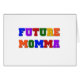 Camisetas, caramelos, tarjetas, pegatinas, botones, bolsos de tote, mousepads y otras prendas de Future Momma con texto de colores primarios.