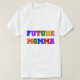 Camisetas, caramelos, tarjetas, pegatinas, botones, bolsos de tote, mousepads y otras prendas de Future Momma con texto de colores primarios.