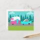Este Camper Retro / Trailer and Car Postcard cuenta con un moderno y minimalista dibujo personalizado de mediados de siglo que le dejará listo para tomar la carretera abierta. Un homenaje a los años 50, este diseño presenta un auto turquesa vintage con la parte blanca, tirando de un remolque de viaje kitschy a su destino final. El RV retro, perfectamente restaurado, tiene una mitad inferior rosa caliente, la mitad superior blanca y un rayo turquesa que separa los dos. La puerta del lado del camper también es de color turquesa. El acento final es el ala rosa caliente que sobresale desde la parte trasera de esta casa sobre ruedas. Los alegres campistas están conduciendo por un camino gris. La carretera está rodeada de exuberante hierba verde. Como telón de fondo, podemos ver las siluetas verde azuladas de un verdadero bosque de cedros, frente a un cielo acuático con nubes esponjosas y azul claro. Este diseño es perfecto para todos los que vienen de hippies retirados, hipsters recién llegados o cualquiera que quiera revivir algunos recuerdos de la infancia grandiosos. La mejor parte es que nadie pregunta: "¿Estamos ahí todavía?"