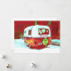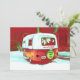 Navidades de camper retro vintage hippie bohemian tarjeta plana de vacaciones rojas verde hippie. Añade tu propio mensaje. Oración y año de 'Feliz Año Nuevo'. Trailer de viaje Cortinas florales de estilo 1960 en la ventana trasera. Diseño único y moderno. Personalice el texto en la parte posterior del remolque si lo desea. Derechos de imagen de Marg Seregelyi Photography.