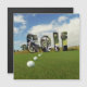 En la foto se ve un campo de golf con pelotas de golf y un logo sobre el techo que se hizo con una imagen de un club de golf