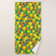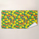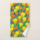 Toalla puesta en un patrón de tulipanes naranjas y amarillos y hojas verdes en un campo