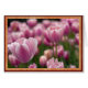Fotografía de color de un campo de tulipanes rosados. 7"x5". Borde decorativo. En blanco.