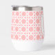 Este elegante diseño de vaso de vino monograma presenta un moderno patrón de caña de mimbre trenzado rosa y blanco en la parte delantera y trasera. El lado frontal tiene un marco rosado con un inicial en blanco.