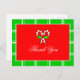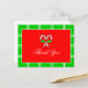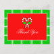 Una linda tarjeta postal de agradecimiento con bastones de caramelo y acebo con un fondo rojo y verde.