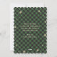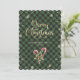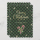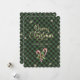 Caligrafía verde Tarjeta navideña de Feliz con copos de nieve, Navidades con latas de dulces, bayas azucaradas y rojas sobre un fondo de manta de búfalo verde.