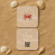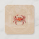 Minimalista tarjeta de visita con un ilustracion acuático pintado a mano con cangrejo en un fondo de arena beige. Perfecto para negocios costeros, restaurantes de mariscos, tiendas de playa o estudios creativos que buscan un tema náutico único. El diseño combina elegancia y ambiente costero con espacio para nombres, detalles de contacto y código QR en la parte posterior.