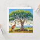 Un canguro Navidad sentado bajo un árbol de goma decorado con baubles y oropel. "Feliz Navidad y Feliz Año Nuevo" texto al revés