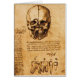 Calavera y dientes de los antiguos estudios anatómicos de Leonardo da Vinci, tinta de pluma y marrón en papel con pergamino antiguo envejecido, efectos gruesos.