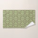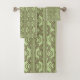Este conjunto de toallas tiene un diseño art decó de tres óvalos rotos en dos rectángulos muy delgados en verde camo sobre un campo de verde claro. ¿Quieres el mismo diseño con colores diferentes? Mándame un mensaje.