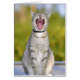Sorprendente fotografía de un gato a rayas sentado derecho, con la cabeza abierta y la boca abierta como si cantara.