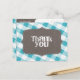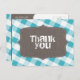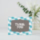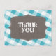 Las postales diseñadas con "Gracias" en blanco sobre un ilustracion de tela de armazón marrón, en un patrón diagonal de gingham turquesa y blanca. El reverso se personaliza con tu propio mensaje personalizado de agradecimiento. También puede borrar fácilmente el texto de la plantilla para dejar la(s) tarjeta(s) en blanco para escribir a mano sus propios sentimientos de gratitud. Estas tarjetas, con su patrón clásico de gingham, son perfectas para las celebraciones de Baby Shower y Southern Bridal Shower.