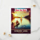 invitación de boda para guardar la fecha, tarjeta postal de viaje. Hermosa puesta de sol sobre el lago, barco de vela en el agua y un hombre tocando la guitarra en la costa.
