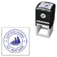 Capitán con su nombre, sello de autotinta del logo de la goleta. emblema circular clásico con su nombre y los campos de nombre de barco en texto en bloque y con velero de goleta en el centro.