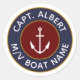 Capitán personalizado con su nombre y nombre de barco pegatinas de todo el logo de ancla náutica. Emblema clásico azul marino y marrón redondo con ancla blanca, carteras de texto y oro sobre un fondo blanco.