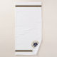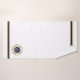 Capitán personalizado con su nombre y nombre del barco toalla de logotipo de ancla náutica. emblema de círculo clásico con ancla y campos de texto en azul marino, blanco y dorado sobre fondo blanco. Borde de rayas azules y doradas de la marina en la parte superior e inferior.