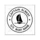 Capitán con su nombre de marca de autotinta del logo de la lancha náutica. emblema circular clásico con su nombre y los campos de nombre del barco en texto en bloque y con velero en el centro.