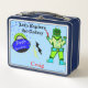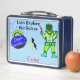 Personajes espaciales de ciencia ficción fantástica personalizado. El robot alienígena de Guay Capitán Zacky y Zippie la nave espacial. Personalizar nombre en texto rojo. Simpático y sonriente Robot verde con un espacio azul verde. Zippie la nave espacial con aspecto de luces 3D se parece a un pez azul con sus ojos azules, nariz y boca sonriente y tiene un fondo negro con puntos azules claros y vigas láser amarillas, la parte trasera del barco tiene tubos de escape plateados, que se lanzan a la galaxia con estrellas azules y pernos amarillos, negros y rojos. El reverso tiene la redacción, el Explorador Espacial con un fondo azul oscuro y estrellas blancas. Diseños originales de obras de arte © 2014 TamiraZDesigns.
