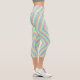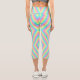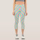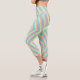 Una persona lleva leggings vibrantes y coloridos con un patrón geométrico de arcoíris, de pie contra un fondo liso. El ambiente es animado y energético.