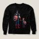 Un conmovedor ilustracion del Capitán América tomándose de la mano con su hijo pequeño, ambos vestidos con uniformes patrióticos y escudos a juego. La poderosa imagen simboliza el amor, la protección y un vínculo heroico entre un padre y su hijo.